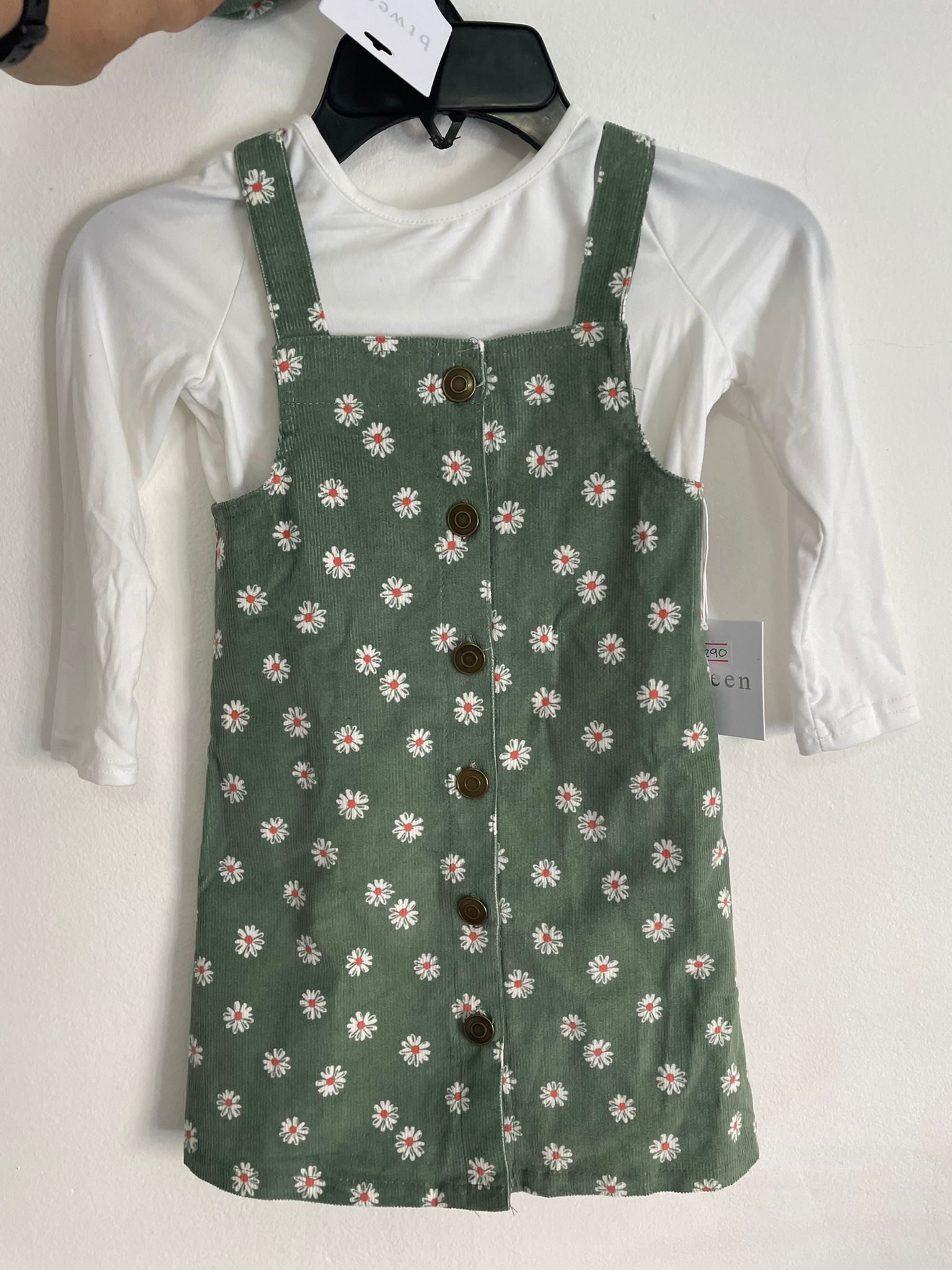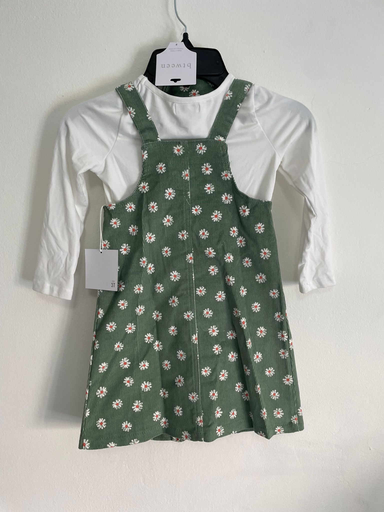 Conjunto Jumper de pana verde floreada con remera blanca y monedero de pana verde floreado en talle 3