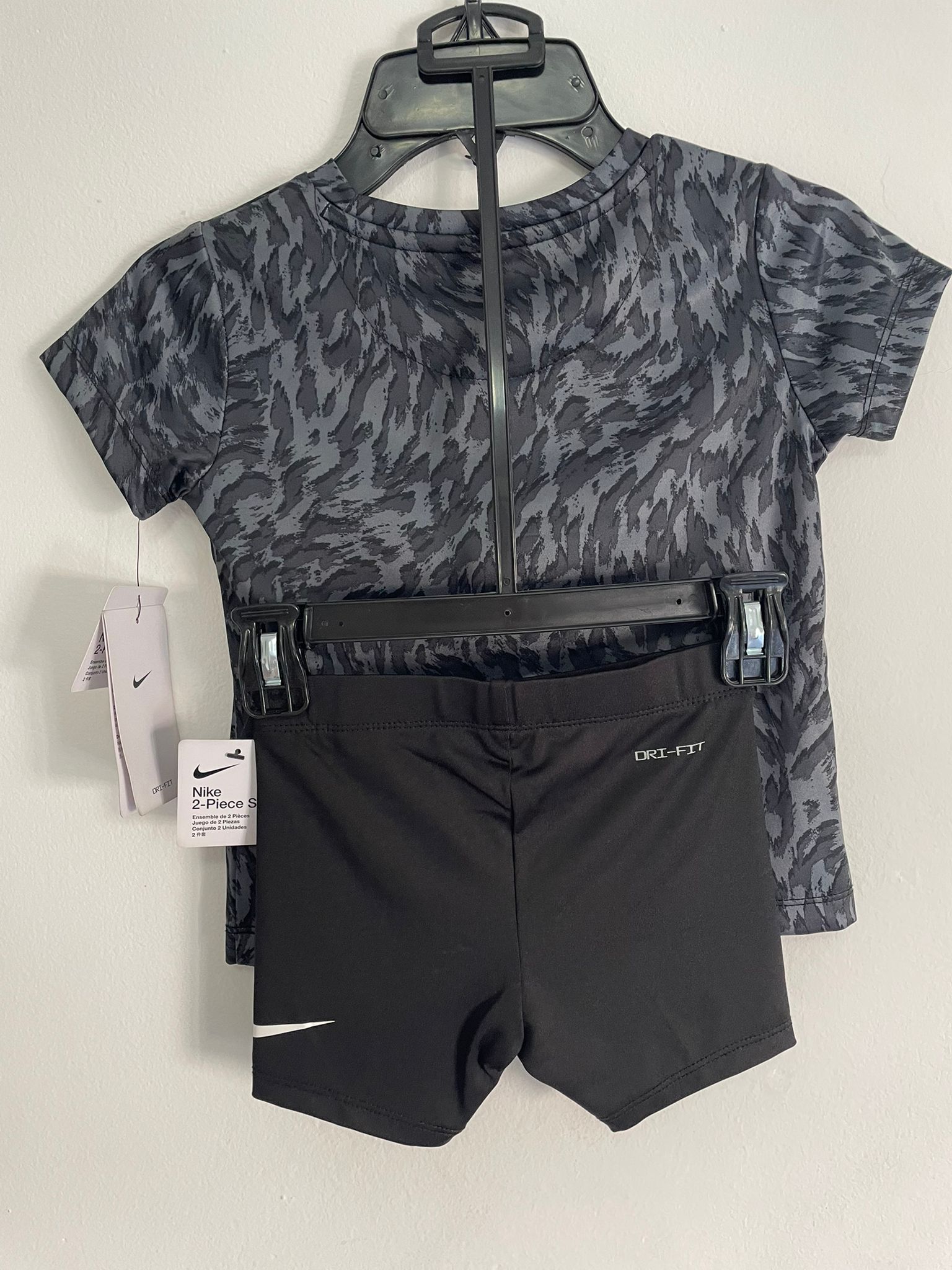 Conjunto de remera animal print negro y gris con calza biker negra marca Nike en talle 3