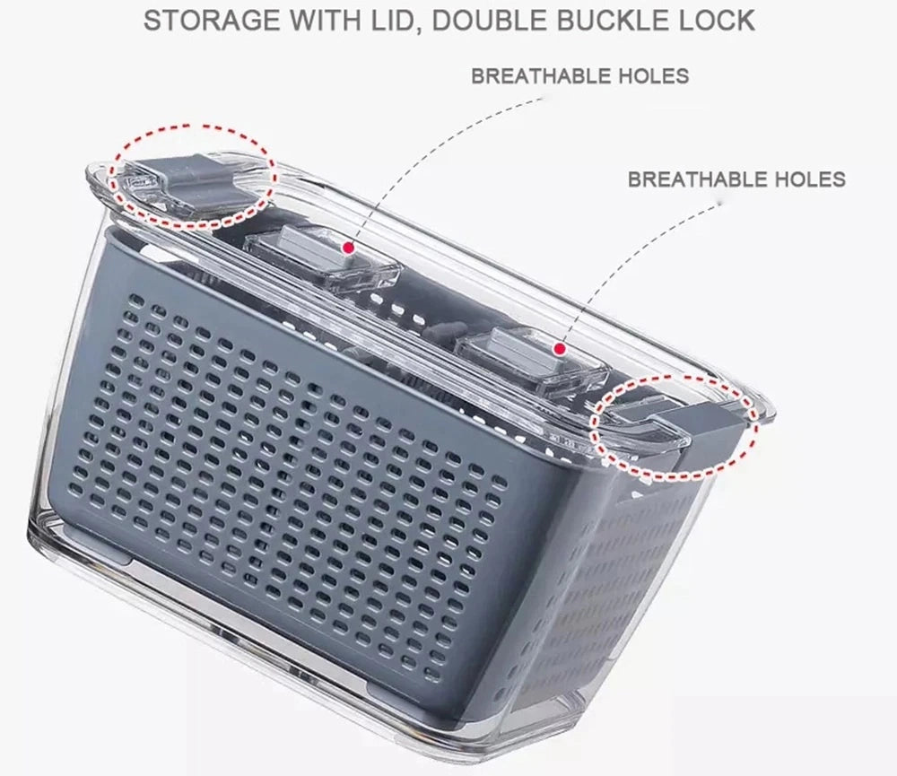El famoso contenedor de TikTok que revoluciona tu heladera. Mantén frutas cortadas frescas por más tiempo con su sistema de drenaje inteligente que separa los líquidos del alimento. Controla la humedad abriendo o cerrando las válvulas de ventilación según necesites: máxima frescura para frutas jugosas, ambiente seco para otros alimentos. Fabricado en PETG grado alimentario, resistente y transparente para ver el contenido al instante. Medida M: 19.8 x 13.3 x 11.4 cm. Diseño práctico en transparente con detalles en gris.