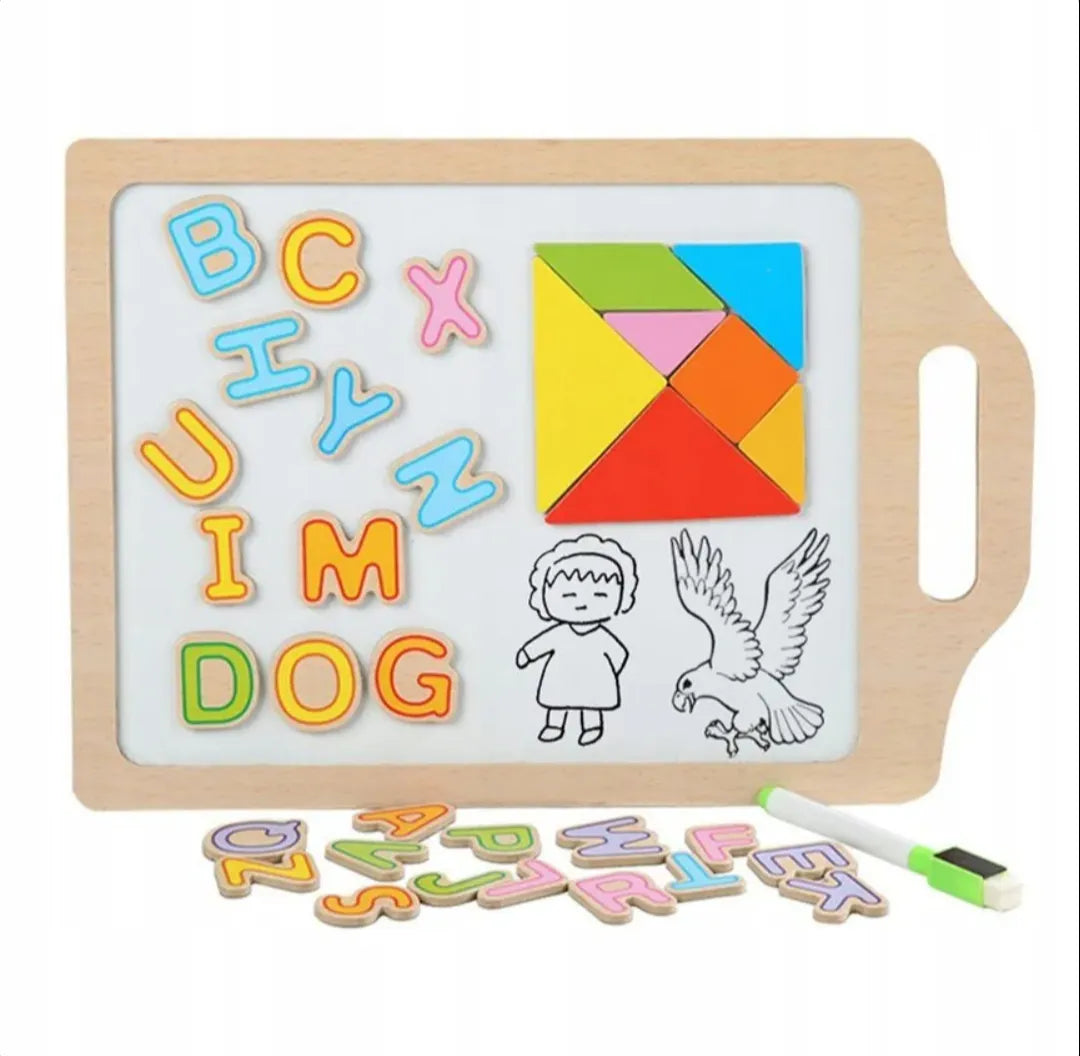 La Pizarra Magnética con Letras y Formas de Madera Montessori incluye un marcador para que los niños puedan escribir y dibujar libremente, fomentando su creatividad y aprendizaje. Esta pizarra combina piezas magnéticas de madera con una superficie para escribir, ideal para desarrollar habilidades motrices, reconocimiento de letras y formas. Su diseño duradero y seguro ofrece una experiencia educativa completa y divertida, perfecta para estimular el desarrollo cognitivo y la imaginación desde temprana edad. Un recurso imprescindible para el aprendizaje activo y entretenido.