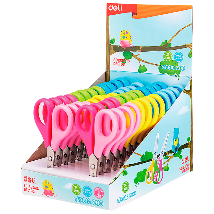Tijera escolar Deli de 114mm con punta roma, diseñada especialmente para niños. El patrón Magic Zoo añade un toque lúdico al útil escolar. Corte limpio y seguro gracias a su punta redondeada que previene accidentes. Construcción robusta ideal para uso frecuente en clase, tareas y proyectos creativos. Ergonómica y fácil de manipular para manos pequeñas. Accesorio indispensable en la mochila escolar.